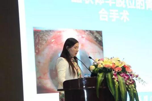 廈門(mén)大學(xué)附屬?gòu)B門(mén)眼科中心眼外傷學(xué)科帶頭人蔡錦紅主任在做“脈絡(luò)膜上腔出血的臨床治療選擇”報(bào)告。