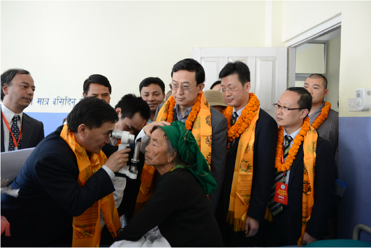術(shù)前,姚曉明博士為患者檢查,確定術(shù)式。專程從90公里以外的首都加德滿都趕來出席光明行啟動儀式的吳春太大使(右三)到病房慰問患者和醫(yī)務(wù)人員。