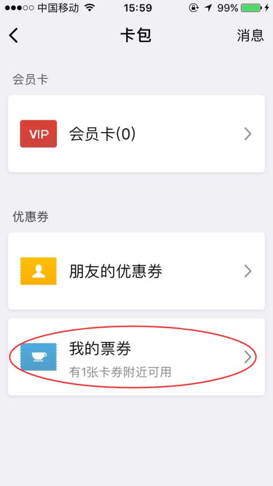 2、點(diǎn)開微信中的我 → 卡包 → 我的票券 → 全飛秒3800元優(yōu)惠券