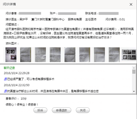 眼科醫(yī)院和南京第一醫(yī)院專家確診為真菌性角膜炎,并患有圓錐角膜近乎晚期,使用相關(guān)藥物沒有好轉(zhuǎn),江西當(dāng)?shù)氐尼t(yī)生建議其先住院清除真菌再手術(shù)。因?yàn)榍宄婢米≡阂粌蓚€(gè)月,剛上研究生的他如果長時(shí)間住院就得休學(xué),實(shí)在進(jìn)退兩難的他,通過眼科通APP接通了廈門眼科中心眼表與角膜??频膶W(xué)科帶頭人吳護(hù)平主任的問診服務(wù),盡管已經(jīng)22:30,吳護(hù)平主任還是耐心解答了他的疑問,并且給出了盡快做角膜移植手術(shù)的建議。因?yàn)閺B門眼科中心有與華廈眼科醫(yī)院集團(tuán)下各地的眼庫聯(lián)動(dòng),所以患者很快就有角膜材料。吳護(hù)平30分鐘內(nèi)的4個(gè)答復(fù)就大大緩解了小雷的焦慮,避免了休學(xué)危機(jī),他連連道謝并打算盡快接受手術(shù)。