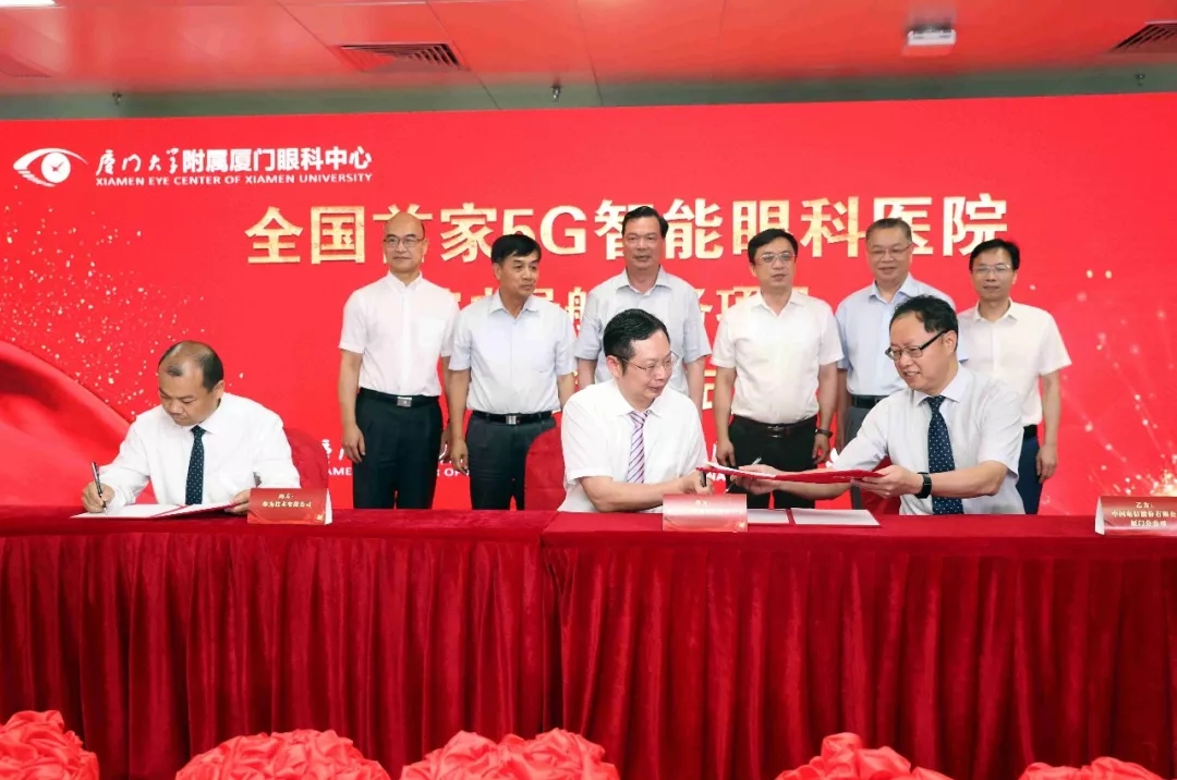 ▲廈門大學附屬廈門眼科中心董事長蘇慶燦與華為移動網絡數(shù)字化集成與運營總經理段學鵬、中國電信廈門分公司總經理黎樹旺正式簽約“5G智能眼科醫(yī)院”
