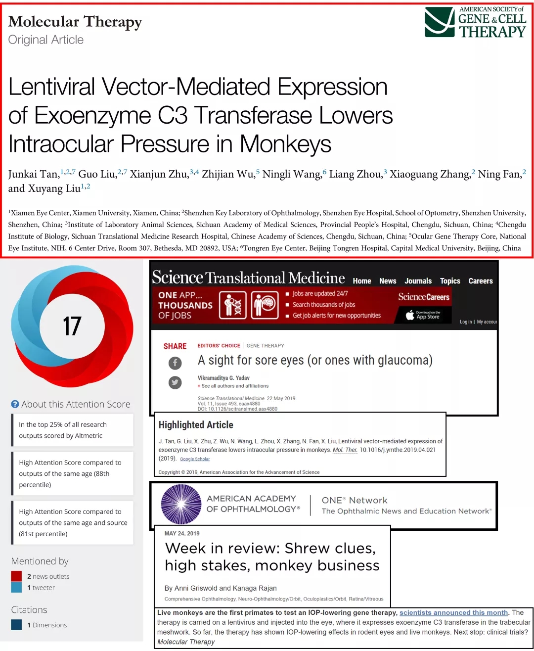 該項研究是以非人靈長類動物恒河猴為實驗對象,應(yīng)用失活病毒作為載體,將有利于房水排出的基因?qū)牒镅坌×?主要房水排出通道),能引起長達112天的眼壓下降,并且未見不良反應(yīng)。此前,成功地將功能基因?qū)牒镅坌×航M織并發(fā)揮降眼壓作用尚未見報道。隨即國際雜志《Science Translational Medicine》(影響因子18分)推薦了該篇研究論文,接著美國眼科學(xué)會(AAO)官方網(wǎng)站對其進行了報道,兩者均認為此項研究有較好的學(xué)術(shù)價值和臨床應(yīng)用前景。目前該篇文章的Altmetric評分(社會化影響力)為17。這是繼近年來年劉旭陽教授團隊在發(fā)表多篇系列研究論文(如去年的美國IOVS雜志)后的又一成果展示,標(biāo)志著該團隊在青光眼基因治療方面的工作正在穩(wěn)步發(fā)展。目前該團隊的相關(guān)工作仍在繼續(xù),比如用改進的基因治療方法已經(jīng)降低猴眼壓達10個月以上,新的文章已經(jīng)投稿,并有望于今年發(fā)表。