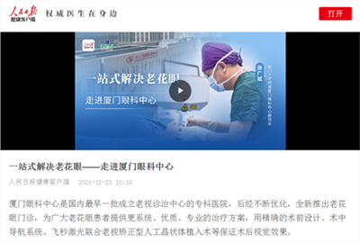 人民日?qǐng)?bào)走進(jìn)廈門(mén)眼科中心,專(zhuān)題報(bào)道老花眼診療,張廣斌院長(zhǎng)受邀做專(zhuān)題采訪。海西晨報(bào)、海峽導(dǎo)報(bào)、東南早報(bào)、健康時(shí)報(bào)、今日頭條、百度健康、騰訊視頻、愛(ài)奇藝、新浪微博等十余個(gè)平臺(tái)聯(lián)袂報(bào)道!