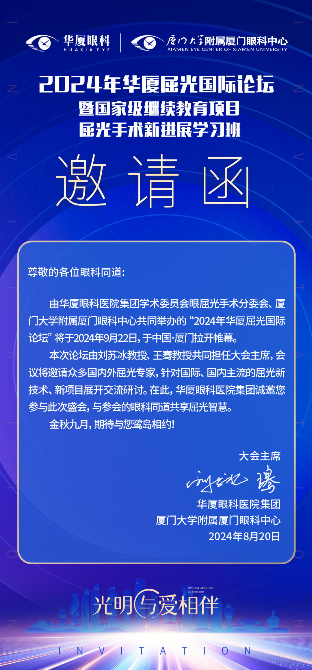 為進(jìn)一步推動眼屈光領(lǐng)域的深入交流及屈光手術(shù)新發(fā)展,值金秋九月之際,由華廈眼科醫(yī)院集團(tuán)學(xué)術(shù)委員會眼屈光手術(shù)分委會、廈門大學(xué)附屬廈門眼科中心共同舉辦的“2024年華廈屈光國際論壇”暨國家級繼續(xù)教育項(xiàng)目“屈光手術(shù)新進(jìn)展學(xué)習(xí)班”將于2024年9月22日在風(fēng)景旖旎的鷺島·廈門舉行。
