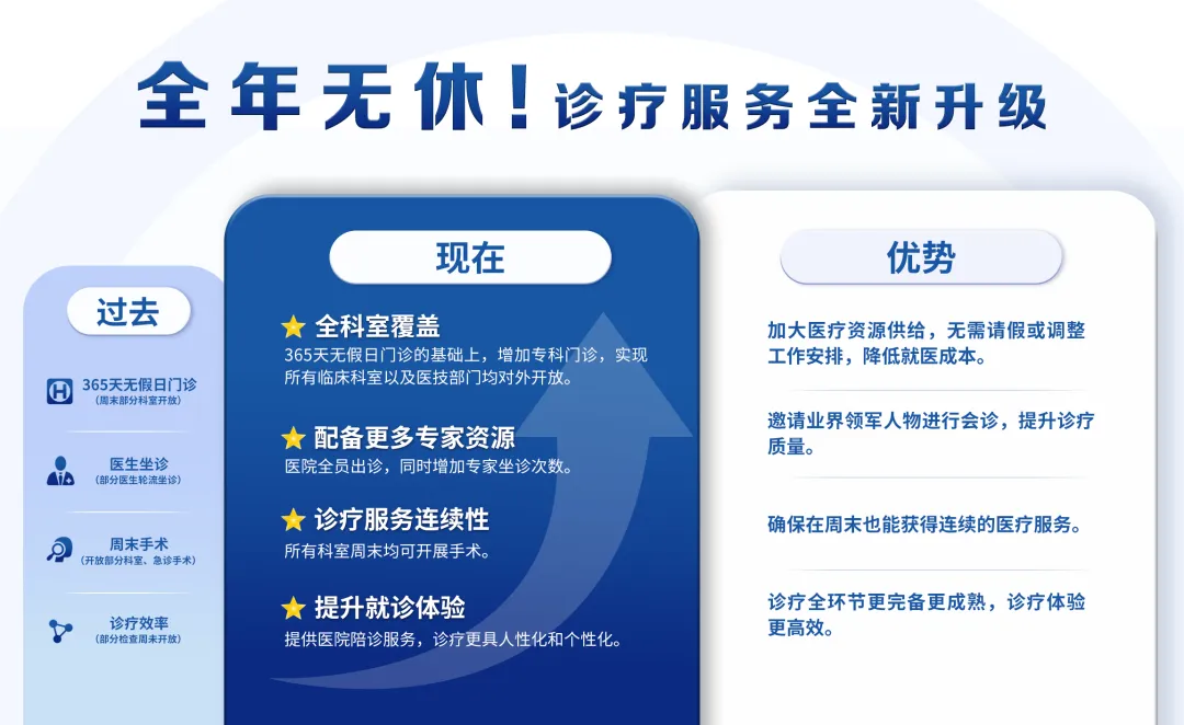 通過實施“無假日門診,診療再升級,周末開通門診”的組合方案,醫(yī)院可以在時間和服務質量上雙重提升,確?;颊咴谌魏螘r間都能獲得高質量的醫(yī)療服務。這不僅提高了患者的就診體驗,也增強了醫(yī)院的整體競爭力和服務水平,真正實現(xiàn)就醫(yī)無障礙,看病無需再請假,周末也能看醫(yī)生!