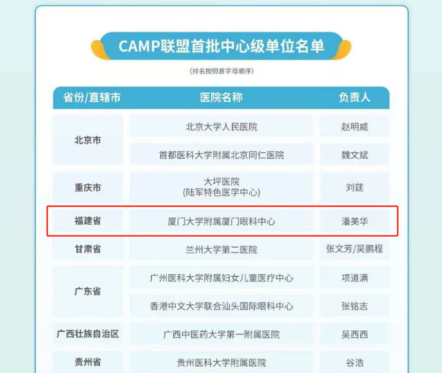 CAMP由國家眼部疾病臨床醫(yī)學研究中心牽頭組建,在健康中國戰(zhàn)略和近視防控政策的指引下,以持續(xù)提升基層眼健康服務(wù)能力為核心,旨在通過整合眼科醫(yī)療資源、科研力量和臨床經(jīng)驗,聚力構(gòu)建一個高效、協(xié)同、創(chuàng)新的近視防控服務(wù)體系和覆蓋全國的眼健康醫(yī)療服務(wù)網(wǎng)絡(luò)。聯(lián)盟啟動報名后,共有來自29個省和直轄市的434家醫(yī)療機構(gòu)報名,其中報名參選中心級單位的有108家,最終遴選出首批中心級單位33家。此次廈門大學附屬廈門眼科中心成功獲選為中心級單位,標志著醫(yī)院在國內(nèi)眼科領(lǐng)域尤其是近視防控領(lǐng)域具有顯著的影響力和專業(yè)能力,是聯(lián)盟推進近視防控工作的重要力量。